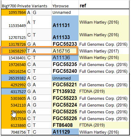 - It is likely that I was anticipating that the two new SNPs in the A11132 Block could have formed a new branch between the new tester and myself. However, I don’t have enough information to evaluate how it was determined that the previous Hartley BigY tested had A16716 and FT226983.