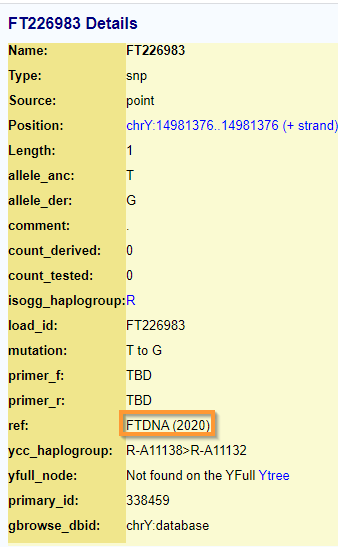 I assume that from this they couldn’t tell if I was FT226983 or not. This was probably a new position that was tested as it is listed in YBrowse under 2020. That means that the other Hartley tester who had the older BigY test wouldn’t have been tested for this.