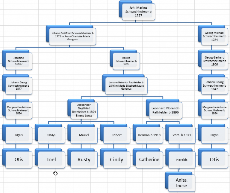 Otis is actually in this tree twice. However, I don’t think I have a tree in it with both AH and Otis. Donna and Iain should be in this tree also under Leonhard Rathfelder. If the AutoKinship Tree is correct, then I may suspect a Schwechheimer connection for AH or a Rathfelder connection for Otis.