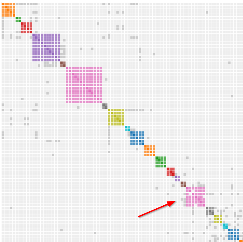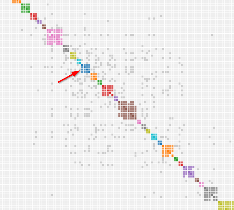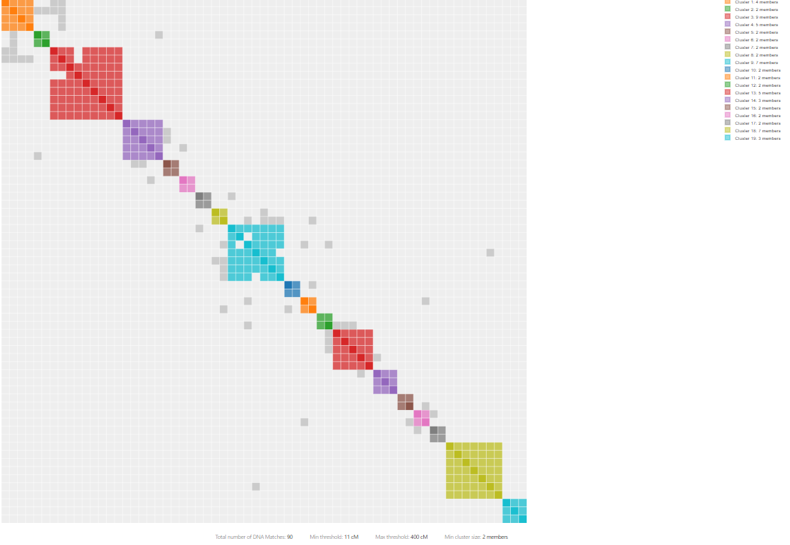 This is near the start of the gray squares. The gray squares indicate that these clusters are inter-related. That is due to my Protestant minority ancestors in Catholic Ireland. They tended to marry others from the Church of Ireland. I have three known Frazer Lines and two known McMaster Lines in my ancestry.