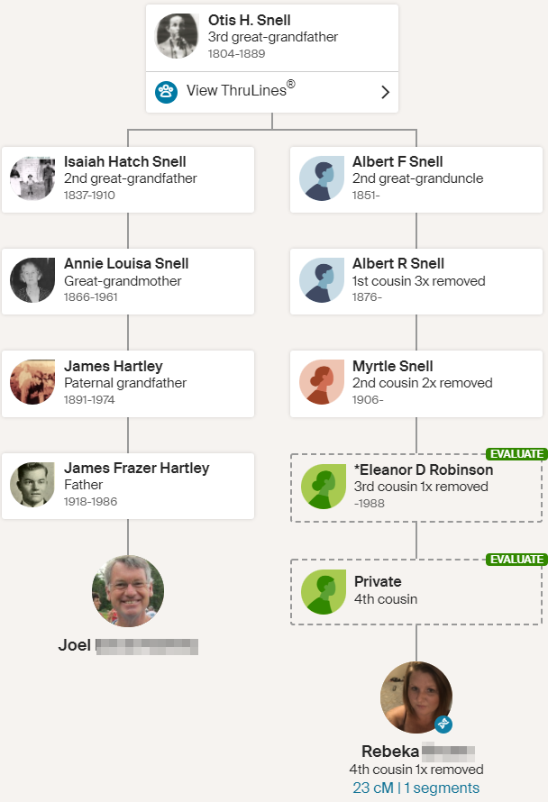 This is also on my Hartley side, but whereas I believe the previous tree goes back to my English Hartleys, I believe that this tree goes back to my Snell side and Colonial Massachusetts. I show a close match as a 1st cousin twice removed to two people. These are actually my second cousins. That means that I should be roughly 4th cousins with the other matches. Of course, that is based on typical matching amounts. It could be that others who matched less are not showing and that these matches could go back further in time – perhaps like the 1600’s match I mentioned above.