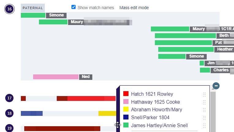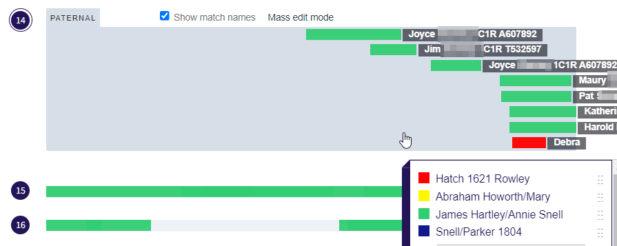 Debra’s DNA does not fill in any blank spots on my Chromosome 14. However, it does identify the right-hand part of Chromosome 14 in that it is Massachusetts Colonial DNA and not English Hartley DNA. I have a lot of green Hartley-Snell DNA identified, but not a lot of it is identified as to whether it is on the Hartley side or Snell side. This DNA is most assuredly on the Snell side. The top two choices for the identity of this DNA are Hatch and Palmer. Both of these connections go back to the 1600’s which is also interesting. Maury in my painted Chromosome 14 is mmg in the AutoKinship Tree and Pat is also there.