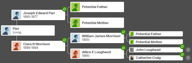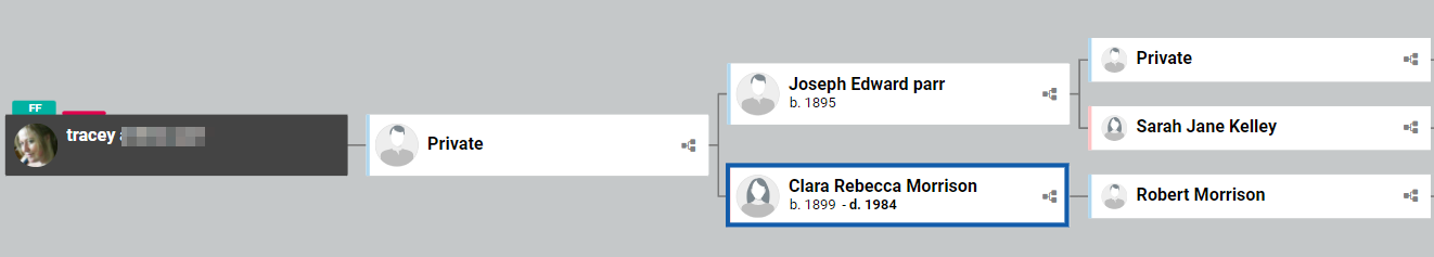 Amy and Tracey have the common ancestors of Joseph Parr and Calra Morrison. That means that I may have shared ancestors going back from one of these two.