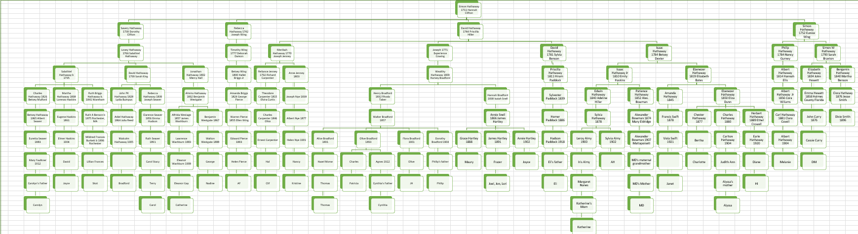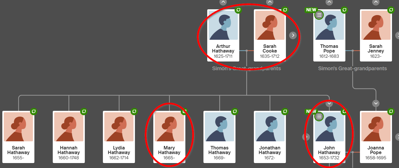 Here we are in the early 1600’s again. Ned descends from Mary Hathaway and I descend from John Hathaway. In my previous DNA/Genealogy tree, I have gone as far back as Simon Hathaway from 1711. This is at Simon’s great-grandparent level, so back another three generations.