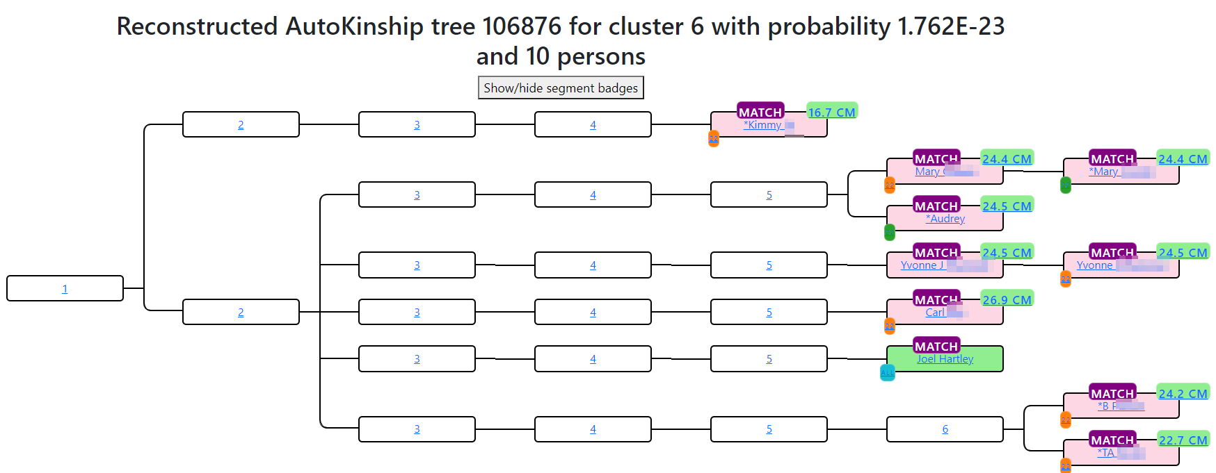This tree has an E-23 probability which seems incredibly small to me. However, of some interest to me is that there re two siblings near the top of the tree and two siblings at the bottom. If correct, then I at the 3rd cousin once removed level with Kimmy and mostly 3rd cousin level with the other DNA matches.