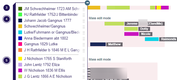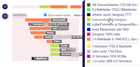 Here my match with Matthew does not fill in blank area. However, as he is beneath the orange matches, it shows that those matches are actually carrying down Gangnus rather than Rathfelder DNA. The match with Carolyn is on the Lentz side and is probably an incorrect match as it is in an area that is supposed to be the Rathfelder side.