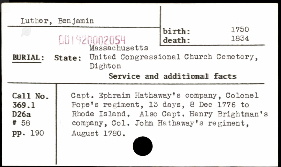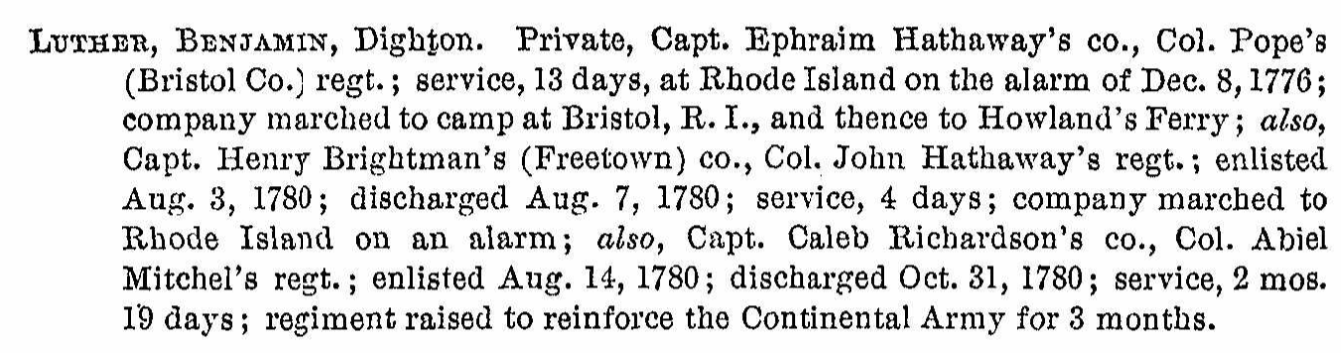 According to the Luther Genealogy, “Benjamin Luther resided in Dighton, was of a family of seamen, and had four master mariners in his family. He was said to have always been spoken of as ‘Captain Benjamin of Dighton.’ He was a Revolutionary soldier, enlisting in Capt. Ephraim Hathaway’s Co., Co. Popes’ Reg’t., on the Alarms of Dec. 8, 1776 and Aug. 1780.”