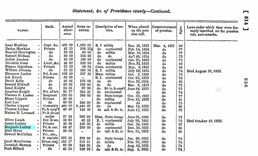 I don’t have much more on this Benjamin Luther. He died in 1834. Apparently there was another Revolutionary War Veteran named Benjamin Luther that lived longer.