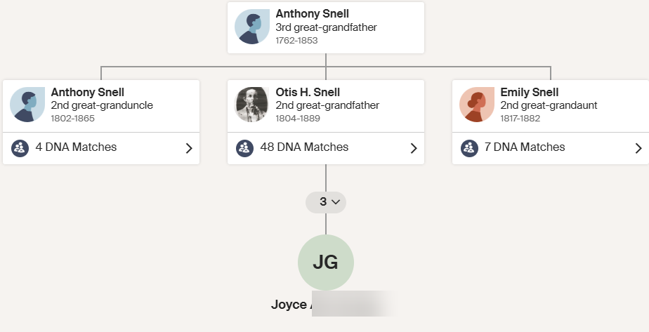 I am not highlighting Anthony Snell here but I would like to mention his DNA as this is a DNA and Genealogy Blog. At a family reunion, I got the DNA from one of my father’s many 1st cousins. Here is Joyce’s connection to Anthony Snell according to ThruLines at Ancestry:
