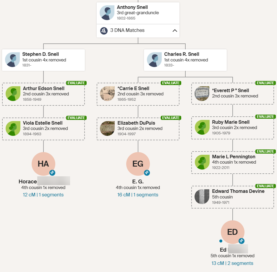 Next, I connect Horace’s line with my Ancestry tree to make it match what is shown on the ThurLines. All this to say that it is very likely that Horace and I share common DNA from Anthony Snell (or his wife Betsy Luther). I have pretty old DNA!