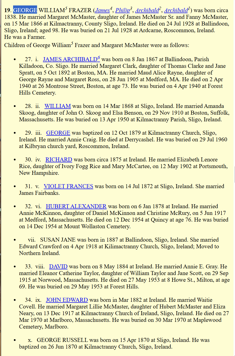 When I went to Ireland, I was told he was known as old George. He is 94 in the Census which would put his birth roughly at 1832. Above, I have him born in 1836.