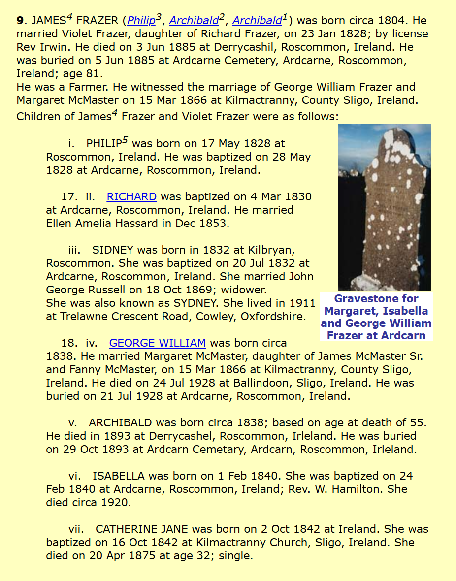 The reason it makes a difference is that in the 1834 Tithe Applotment, there is a James Frazer – assumed to be the father of George Frazer who lived in Derrycashel. As a result, I have assumed that George was born in Derrycashel. In the 1926 Census, George is said to have been born in Kilbrian, County Roscommon. If George were born in Kilbrian, the family may have lived there at the time and moved to Derrycashel. However, my guess is that George was baptized at the Kilbryan Church as this was likely closer to Derrycashel.
