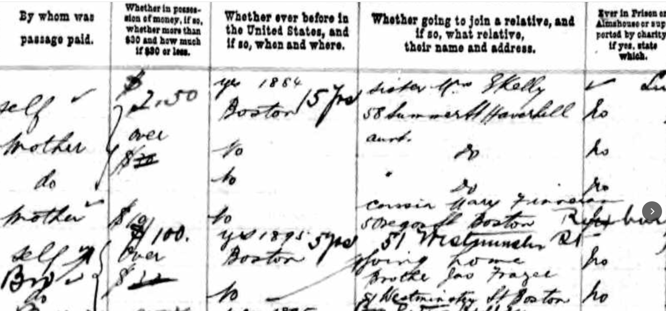 There is a lot of information in here and it is somewhat difficult to line up the information. It appears that William had been to Boston before for what appears to be 5 years. So maybe between 1890 and 1895. He is staying with James his brother at 51 Westminster St. Richard’s ticket was perhaps paid for by his brother (James?). I assume that William had saved up money before as it is said he paid for his own ticket. Confusingly, the 1910 Census says that William came to the US in 1870 which cannot be right. I am thiinking that it should have said 1890.