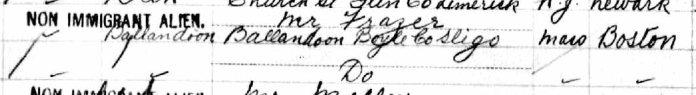William was born in Ballindoon on 14 March 1868. He came to Boston in 1898. From what I understand, my great-grandfather helped to pay to bring his brothers over to Boston from Ballindoon. My great-grandfather came to Boston in 1887. William came to Boston in 1898 or 11 years later.
