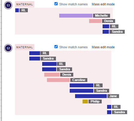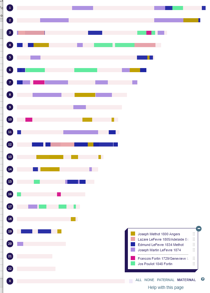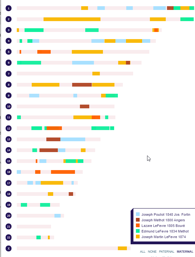 That overlap was with Doris who had Delisle/Lanouette shared ancestors back in 1715. Melanie raises Richard’s mapped percentages to 40% maternal and 25% overall.