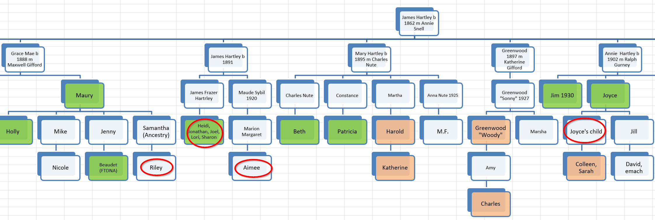 So as I think of the matches, it occurs to me that going forward in time from Mary Pilling, there would be matches that descend from Mary Pilling. However, going back from Mary Pilling, there should be no Hartley descendants that match us unless it is by coincidence. Hmmm…