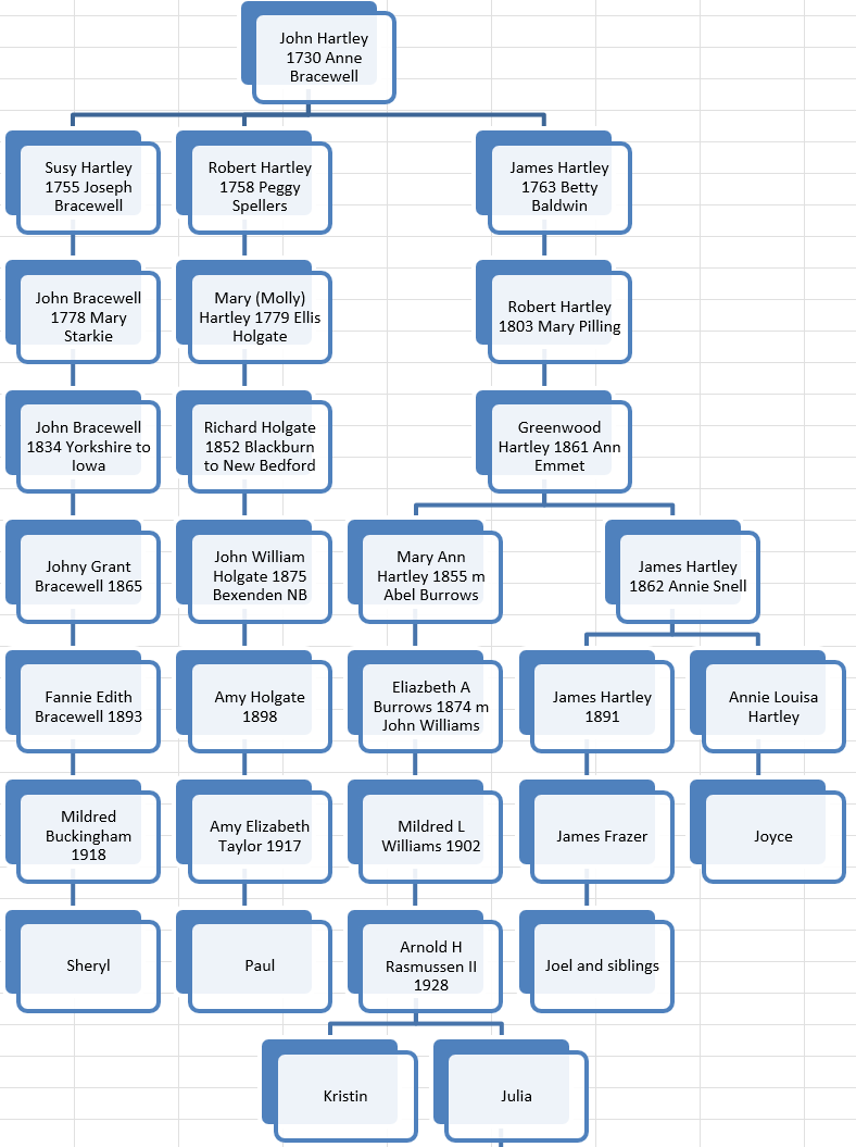 George is somehow connected to the Wilkinson side, but I do not know how exactly. The next cluster is from from Ann Hartley. She was the daughter of Greenwood Hartley who was the son of Mary Pilling.