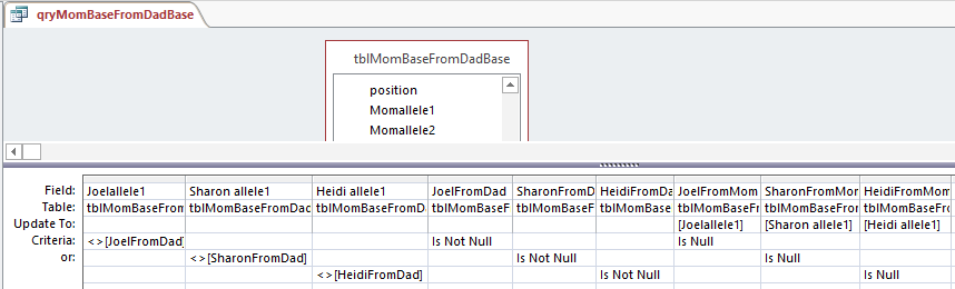 My Last updated Paternal Table was updating ABA, so I’ll copy that to a new Table called tblDadPatternUpdateABB. I’ll also copy my last query and put in the appropriate Starts and Stops for the paternal ABB patterns. Again,