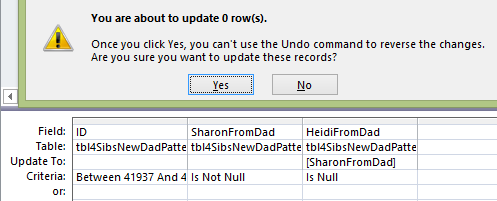 I copied that resulting Table to tblDadPatternUpdateABA and reran the 2 ABA Update Queries. Here is one of the rerun queries updating the ABA Paternal Table:
