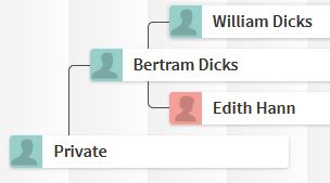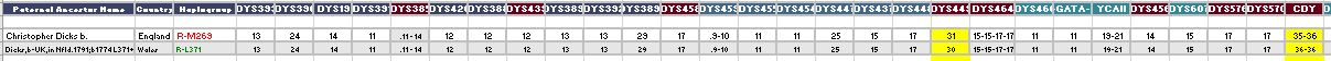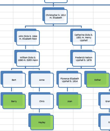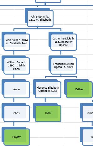 Now I have a little bit of paternal informatiion, but I appear to be at an impasse. Next, I will look at Joan’s Excel spreadsheet of matches. I see a Hayley there that matches through the Dicks Line. Dicks is a mother of Upshall, so that counts as an Upshall for my purposes. Here is Joan’s match with Hayley: