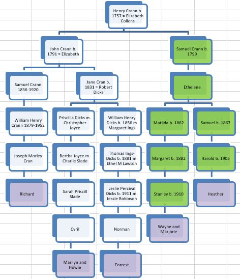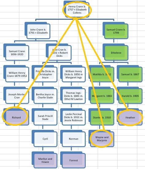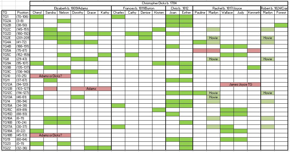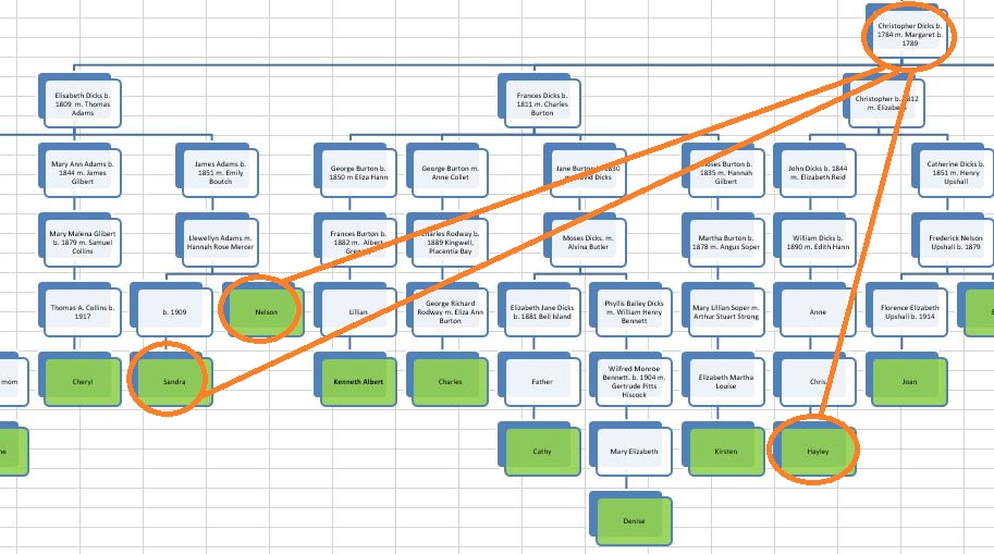 Melissa adds some information. She represents the Ellis side. She matches Joan, but not Elaine. As Melissa does not match Elaine in this location, I have put down the paternal grandmother Daley in Elaine’s segment below Joan’s Ellis segment: