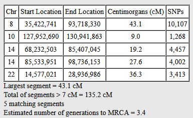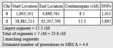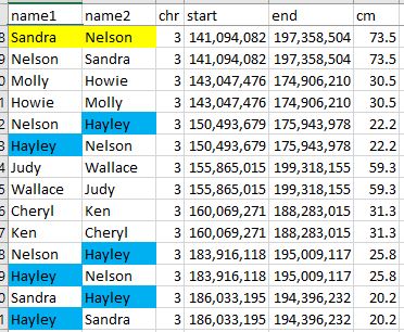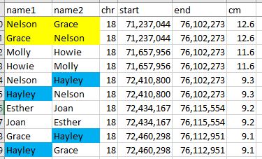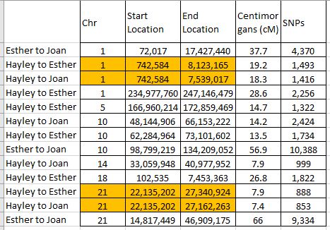 Actually, it looks like I made a mistake. My first comparison of Joan and Elaine is the same as Esther and Joan, so I must have done it wrong. I’ll make sure I have Joan and Elaine this time and lower the levels to 3 cM and 300 SNPs. Now my results look more reasonable.