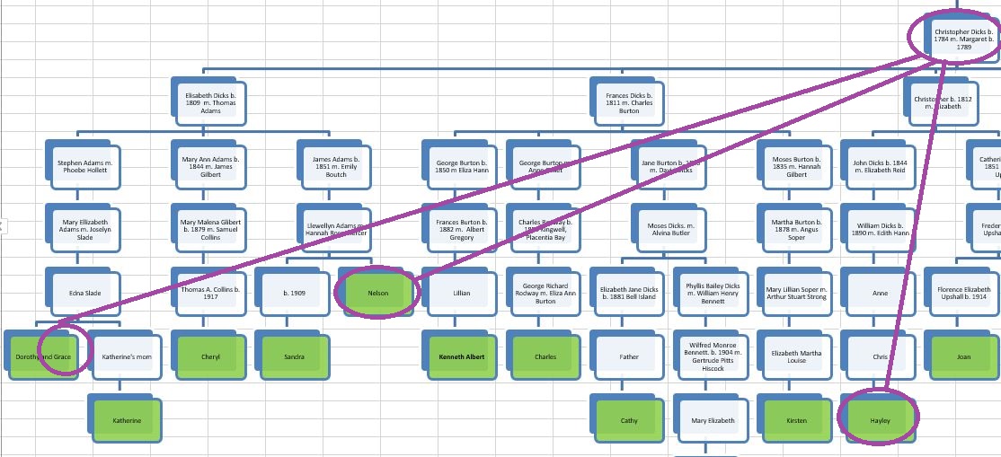 I recently had my wife’s Aunt Elaine’s DNA tested. She is the only sibling of my mother in law Joan. I would like to try to visually phase these two. Fortunately, they have have a half Aunt Esther. She is related on only one of their grandparent’s sides. That side is Upshall from Newfoundland. I am hoping that Esther’s DNA results will be helpful in visually phasing.