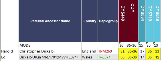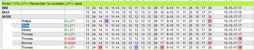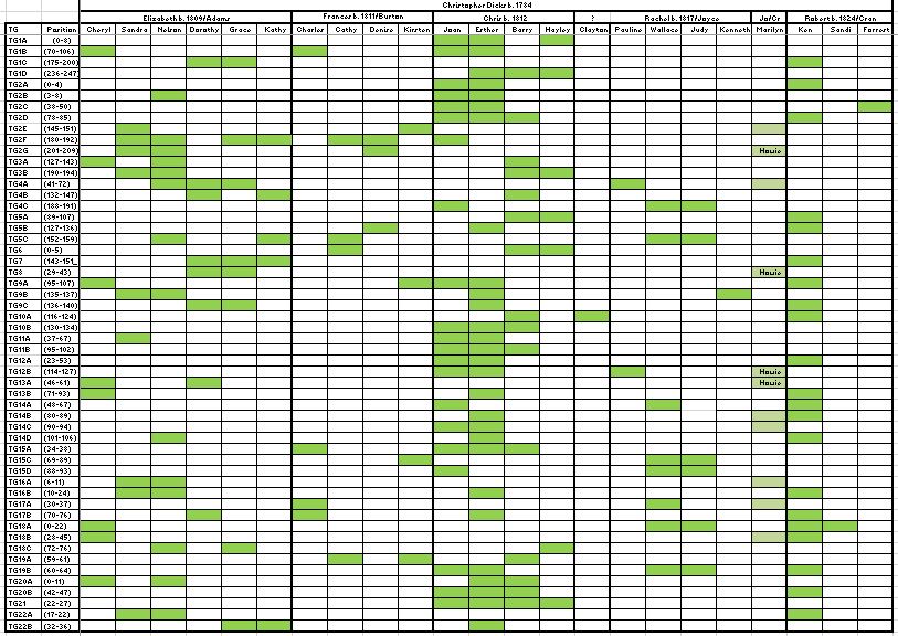 In the Dicks DNA Project I have been working on, I have a Triangulation Group Summary. The mother of Fred Upshall was a Dicks, so Dicks helps to identify Upshall DNA. Here is a partial shot of that Summary for Chromosome 1: