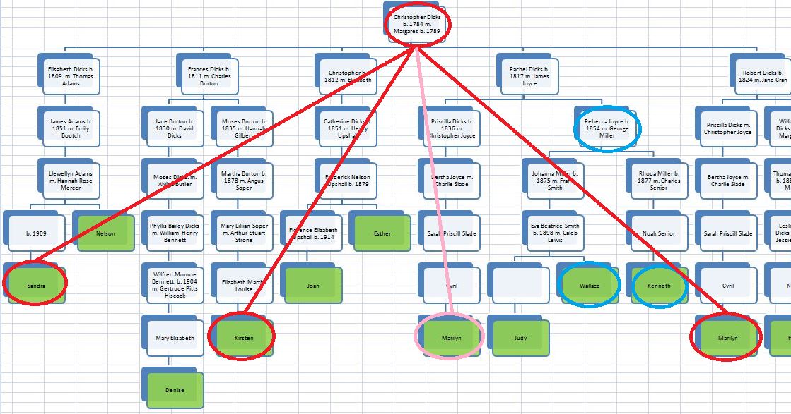 Here the TG is shown in circles and lines. Wallace and Kenneth are in the blue circles with their Miller common ancestor. Marilyn doesn’t match Wallace and Kenneth here, but she wouldn’t anyway as she does not descend from the Miller line. That means that her part of the TG could be from the pink line or the red line on the right. If Marilyn had matched Wallace and Kenneth, that would prove that she matched on the Dicks/Joyce Line. The fact that she doesn’t match means that she matches Sandra and Kirsten either on the Dicks/Joyce Line or the Dicks/Cran Line. It gets complicated, so that is why I chart these matches where I can see them.