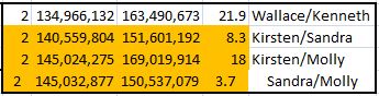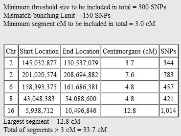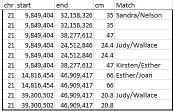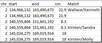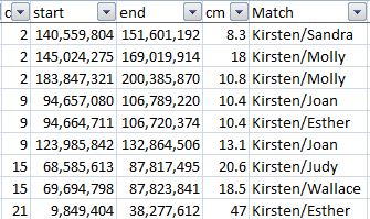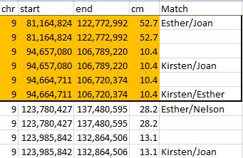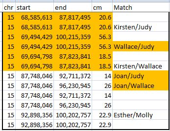 Here, Kirsten is in a TG with Wallace and Judy from position 69 to 88. Wallace and Judy are in another TG described in a previous Blog with Joan from 88 to 93. There were actually 2 other Chromosome 15 TGs mentioned in that Blog. Here is the third TG with Kirsten at Chromosome 15: