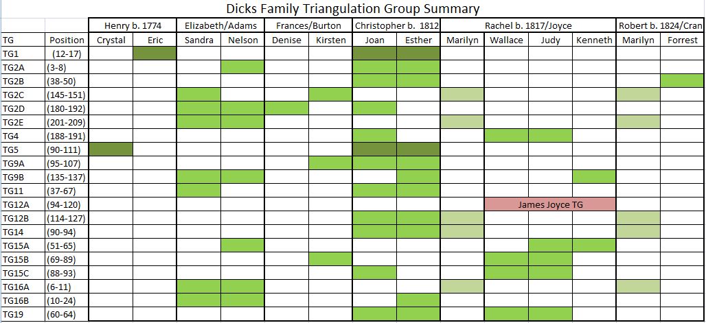 I mentioned that I found 3 new TGs in this Blog alone. I would like to sum up all the TGs to date. The dark green are for Henry Dicks b. 1774. Raspberry is the non-Dicks TG.