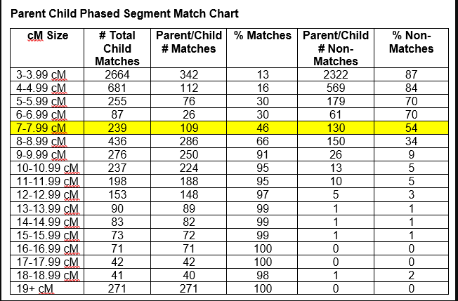 These studies seem to show that there is about a 50% chance of a 7 cM match being real. This goes up to a 66% chance of being real for an 8.5 cM match. It looks like Mr Gray fell into that 34% range. The only other possibility is that Jane’s mother could have had a false negative match with Mr. Gray. All in all, I would say that these results would be inconclusive. For me, I tend to say if there is no match on the two phased kits, then there is no match.