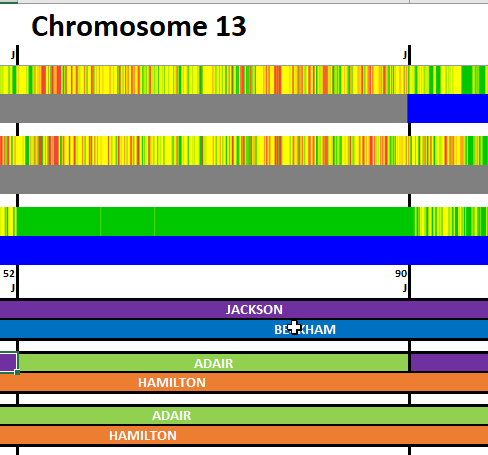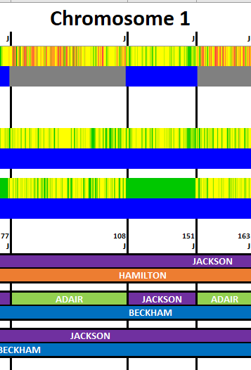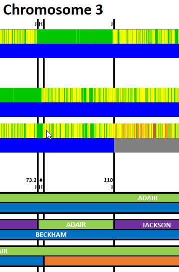 Here is the right side of Jane’s Chromosome 2 Map. Jane is in the middle bar and her maternal side is on the top bar.