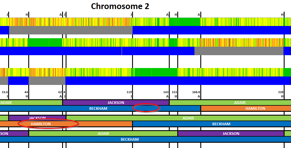 For me the match points to Beckham, for Heather it points to Beckham but for Alex it points to Hamilton. Unless it is on Mum’s side as indicated by Jackson for all three of us, but then why wouldn’t Mum share DNA with Mr. Gray?