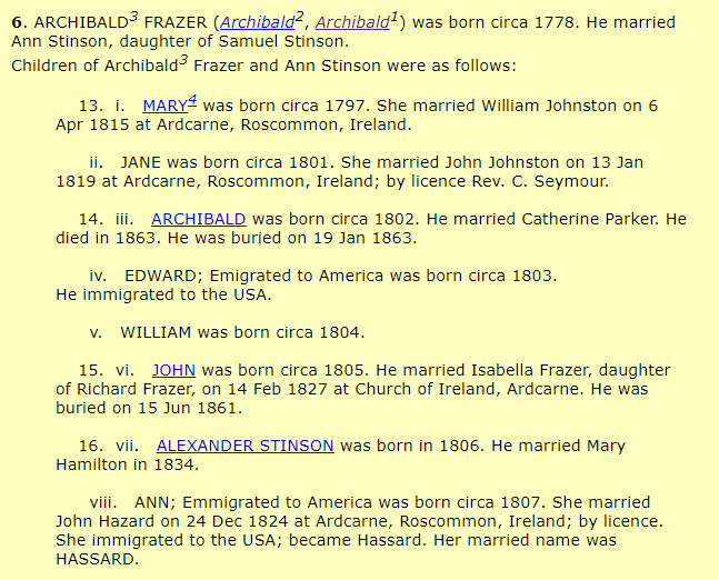 Building my own tree for Deborah was taking too long, so I decided to try other sources. I did a search for trees with Ann Stinson and Archibald Frazer. The first tree that comes up references my own web site: