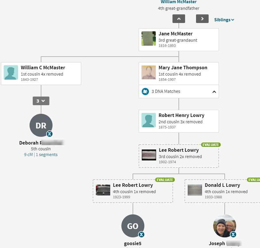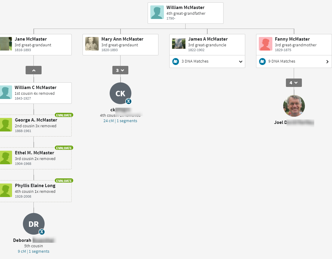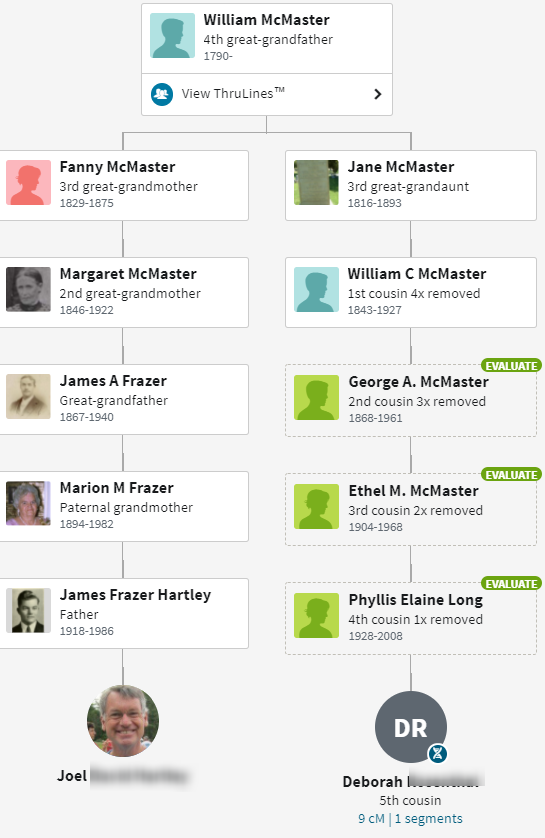 It looks like I cut off Joseph’s child Kelci who is also a DNA match. My sister Heidi also matches Deborah. Deborah is from the McMaster Line. Jane first married George McMaster, then a Thompson.