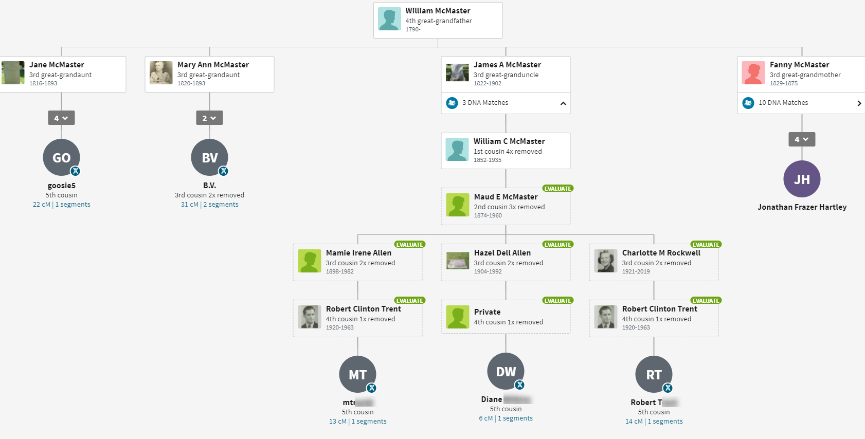 Of the above, Frank is interesting, because it adds another McMaster Line. Here is what AncestryDNA shows: