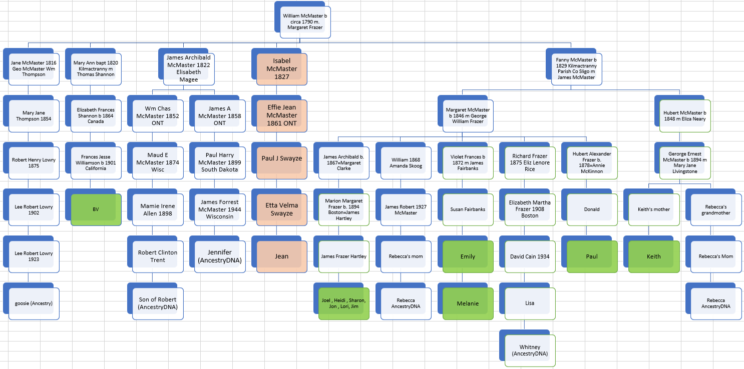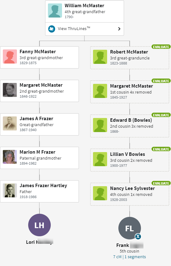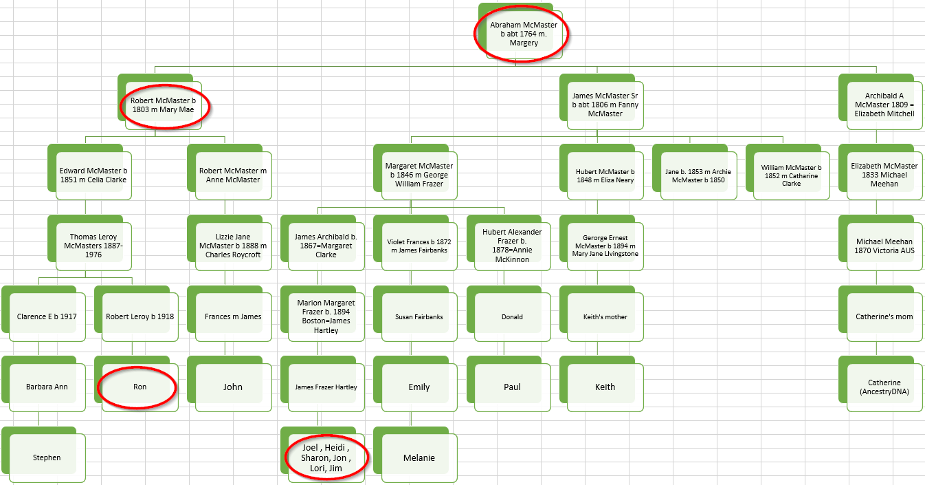 I also note that Lori and Frank have shared a shared DNA match with Ron who I circled. I added in Frank in the Abraham McMaster tree:
