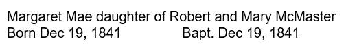 If this is not right, then there would have been three Margaret McMasters around the same time! I have Frank in a different color which means I am not positive. Under this scenario, my ancestor Margaret and Frank’s ancestor Margaret Mae would be first cousins. Here is the baptismal record for Margaret Mae: