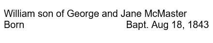 William was clearly born in Ireland, but many of these Irish McMaster families liked to stress that they were from Scotland. Here is William’s baptismal record from Kilmactranny Parish, County Sligo, Ireland: