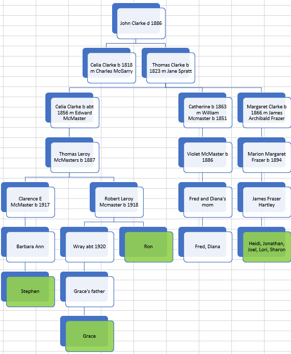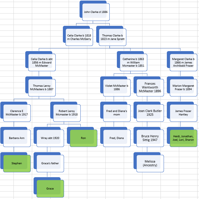 That means that Melissa is my familys’ first DNA match from the Catherine Clark Line that I know of. These relationships are a bit confusing. Celia Clarke and Catherine Clarke both married McMasters. Margaret Clarke (my great-grandmother) married a Frazer who was the son of a McMaster.