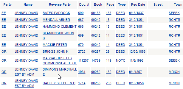 He is mostly on the receiving end (“EE”) until 1853. David dies in 1855. The last two transaction are for the Estate of David Jenney. David sold some land to John Briggs at the Great Neck in Rochester in 1851 for $3. The second sale to Simmons is for Joseph Jenney’s widow dower in or near the Old Landing in Marion. The third sale also mentions Great Neck.